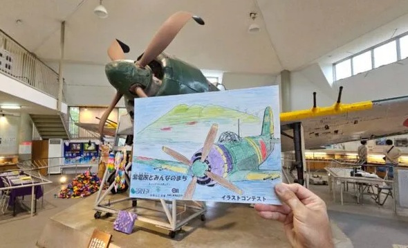 2027年度オープン予定の新展示館をイメージして印刷された紫電改のまわりを自由な発想で描く「未来の展示館の風景イラスト」を募集します!