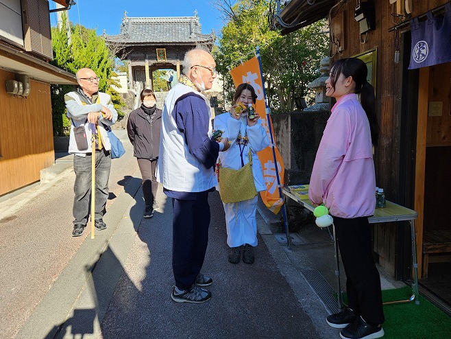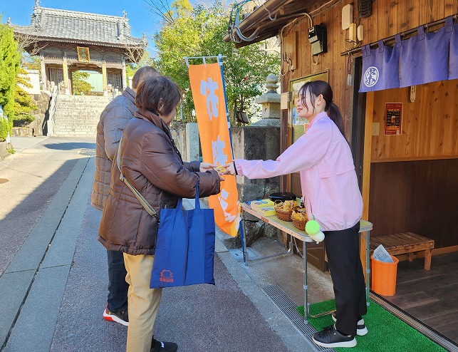 令和7年12月16日(火)10:00~12:00第40番札所観自在寺で愛南町観光協会がお遍路さんに対するお接待を実施、パンフレットを配りながら愛南町のPRも行いました!この日は朝の冷え込みは厳しかったですが、日中は晴れて暖かく絶好のお接待日和となり☀観光協会関係者2名、Ray-g.Vegetables1名で協力してじゃこ天、なーしくんどら焼き、お茶をお接待させていただきました🍵今日は県外からの方がほとんどで北海道、青森など遠方からもお参りに来られていました。この時期人数は少し少なめでしたが、お接待をとても喜んでいただきました。みなさんこの先の道中もお気を付けて!!